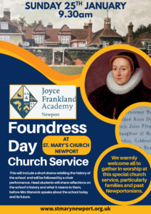 Please join us on Sunday the 25th of January at St Mary’s Church, Newport at 9.30 am for our Foundress Day Service. The service will include a short drama retelling the history of the school and will be followed by a choir performance. Mrs Warwick, Academy Principal, will speak about the school today and it’s future.