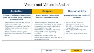 2.Academy routines and habits demonstrate our aspirational culture. These routines and habits are taught, modelled, fully embedded, consistently followed by all, and supported by parents; this ensures uniform is worn with pride, students are equipped for learning, learning continues without disruption, and all members of the community feel respected, supported, and have a sense of belonging.